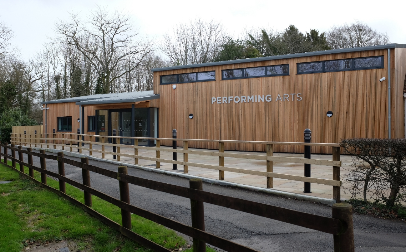 Demolition of existing single storey building and replacement single storey extension to provide a new dance and music academy. The building is designed to blend into the surrounding landscape by the use of vertical timber external cladding with shadow gaps and flush mounted glazing.