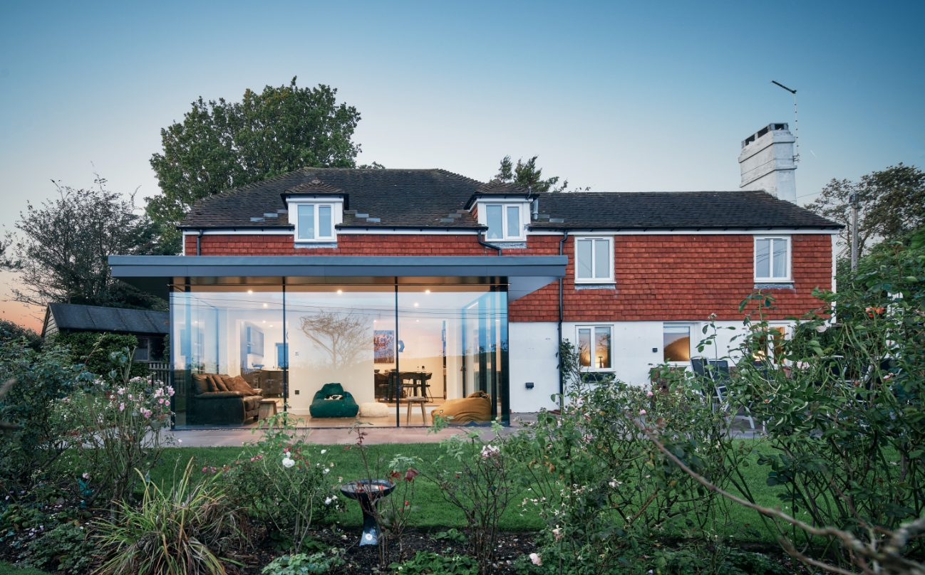 Sited in the stunning Sussex countryside, enjoying views across the south Weald, Fir Tree Cottage boosts a contemporary rear garden room extension enjoying panoramic vistas of a country garden and beyond.